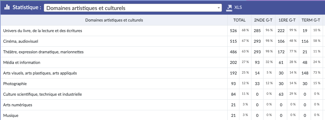En regardant le total, sur la gauche du tableau, vous avez votre taux de couverture EAC des élèves. Ici, ce lycée pris en exemple, à un taux de couverture EAC de 96%. C’est-à-dire que 96% des élèves de l’établissement bénéficient d’un enseignement, d’un projet ou d’une action culturelle.