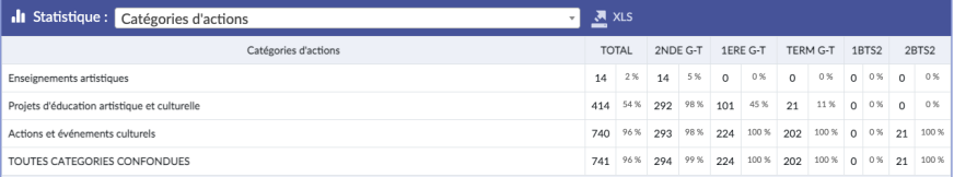 La statistique Type d’actions vous permet de mesurer la part de vos élèves, par niveau de classe, bénéficiant d’un enseignement artistique, d’un appel à projets ou dispositif, ou d’un autre projet.