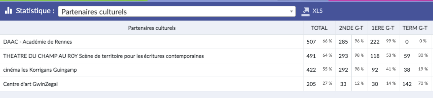 La quatrième statistiques vous indiquent le pourcentage d’élèves ayant participé à un projet avec un partenaire culturel donné. Ici, presque deux tiers des élèves ont participé à un projet ou une action en partenariat avec le théâtre du Champ au Roy à Guingamp.