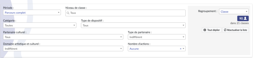 En sélectionnant Aucun dans la case Nombre d’actions, vous verrez l’ensemble des élèves n’ayant bénéficié d’aucun projet EAC. Ici, 90 élèves, répartis dans 21 classes, n’ont pas bénéficié de projet EAC renseigné dans Adage durant leur parcours scolaire.
