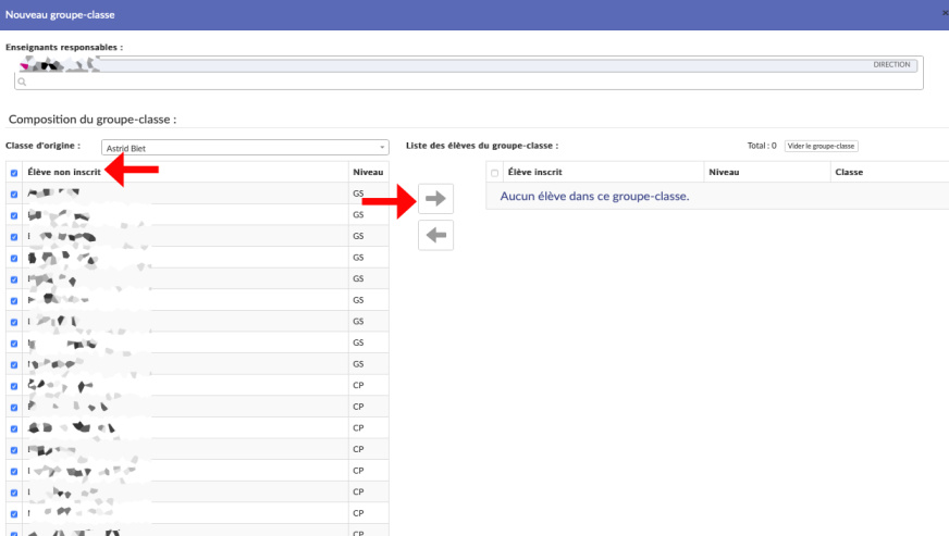 Vous pouvez sélectionner les élèves un par un, ou cliquer sur la case à cocher à côté de Élève non inscrit pour sélectionner tous les élèves. Il vous suffit ensuite de cliquer sur la flèche droite pour faire passer les élèves de l’autre côté et ainsi les intégrer au groupe classe.
